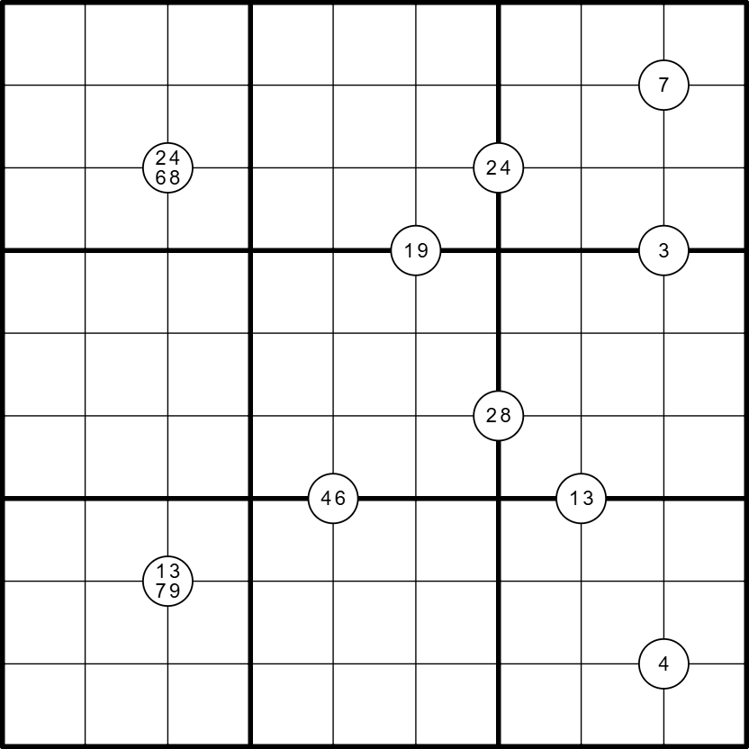 Quads: Digits in a white circle must appear in a cell touching the circle.