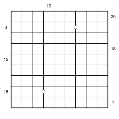 Clues outside the grid are dual: They are sandwich clues, giving the total of the digits between the 1 and the 9 in the row or column. They are also X-sums clues, giving the total of the first X digits in the row or column. X is the digit in the first cell seen from the clue.