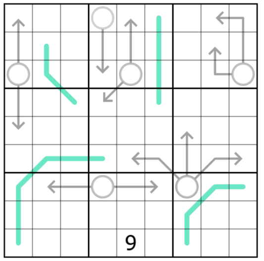 3. Teal lines are modular lines. Any set of three sequential cells along a teal line contains one digit from (1,4,7), (2,5,8), and (3,6,9).