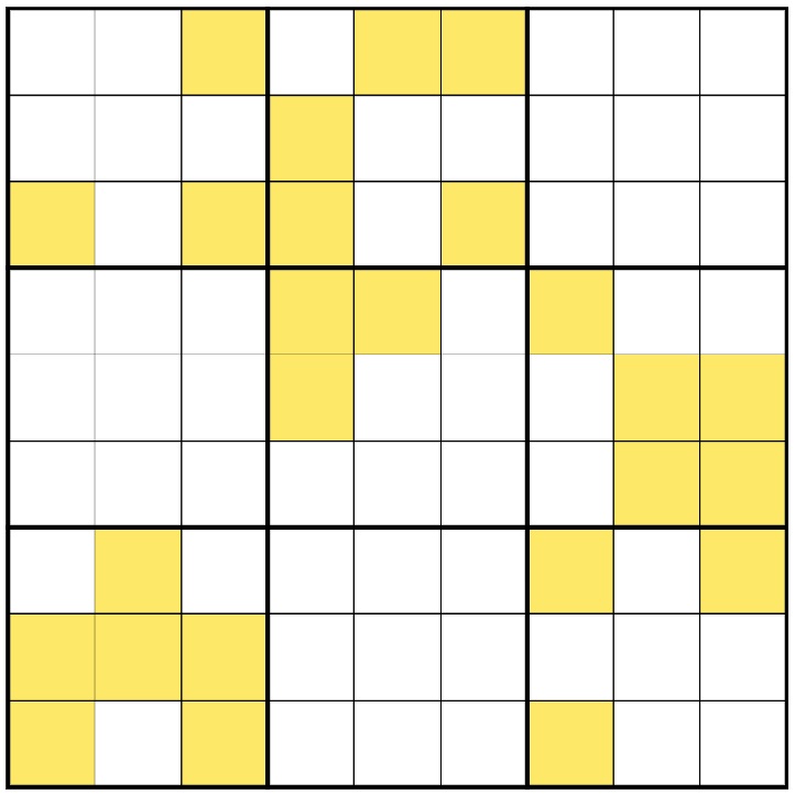 For example the gold cell R5C9 contains either 9 (position in row), 5 (position in column) or 6 (position in box).