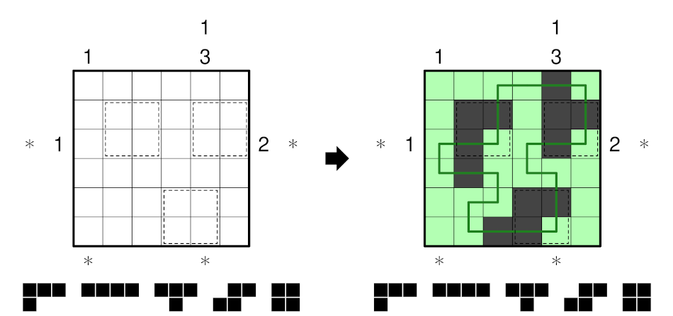 - In each row and column with clues, two sets of clues (left/right for rows and above/below for columns) are provided. One clue set consists entirely of 'Loop clues' and the other of 'Pentomino clues' (both defined below), to be deduced by the solver. All given clue sets are complete, but are not necessarily in order. An asterisk represents any number of clues (possibly zero).