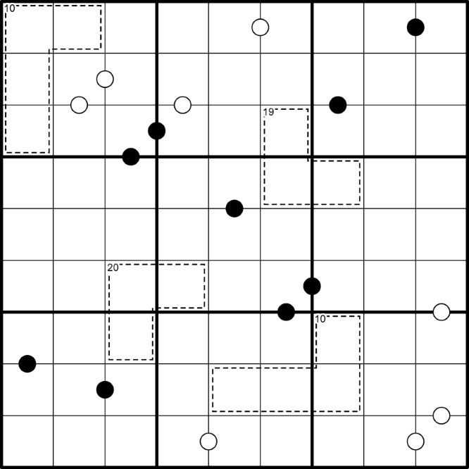 • Digits in cells separated by a black dot must be in a 2:1 ratio, digits in cells separated by a white dot must be consecutive - not all dots are shown