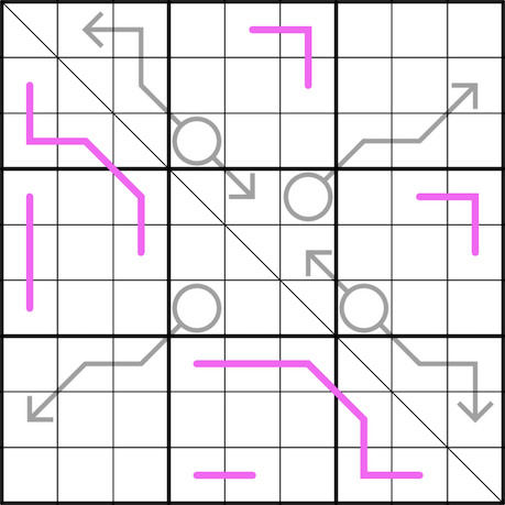 Very nice interaction between the lines. Not an easy puzzle, but very satisfying to solve it (after some time...)