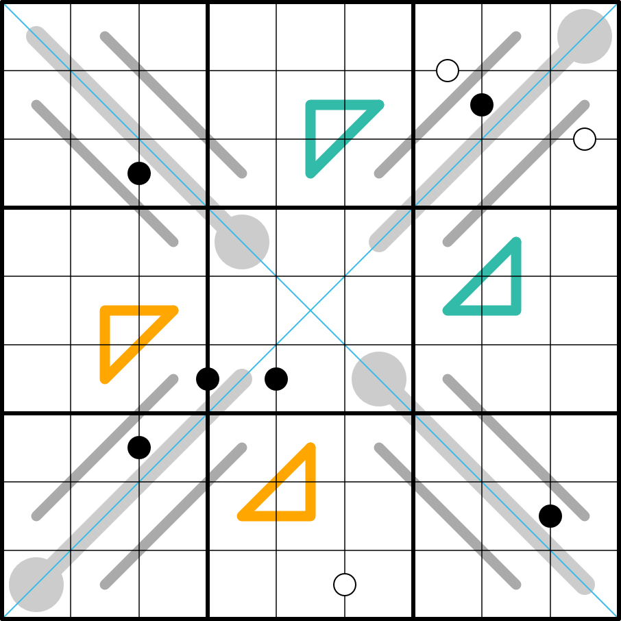 - Normal Sudoku rules apply, and each full diagonal also contains the digits 1 to 9.