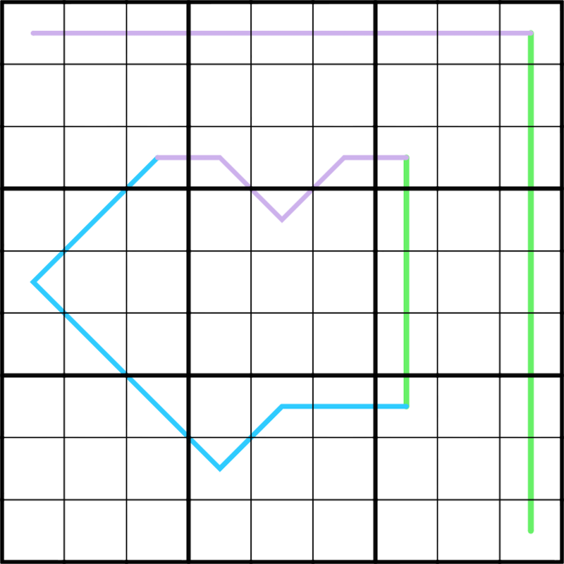 - Values at equal distance to the center of a lavender line sum to the central value.