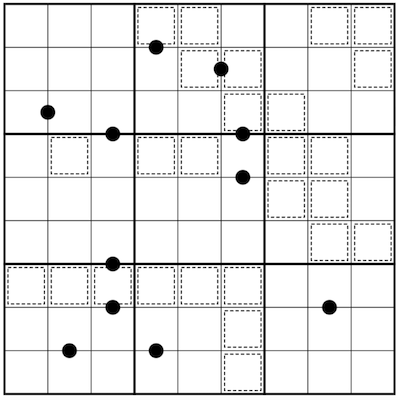 Shade cells using two colours such that each colour forms an orthogonally connected region, and no 2x2 area is a single colour.