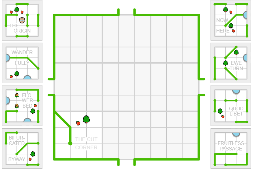 The hedge maze must be mapped out by placing all nine pieces into the grid, one into each box, without overlapping. The pieces may not be rotated or flipped. One piece has been placed already and may not be moved. Hedges do not need to match up between adjacent pieces.