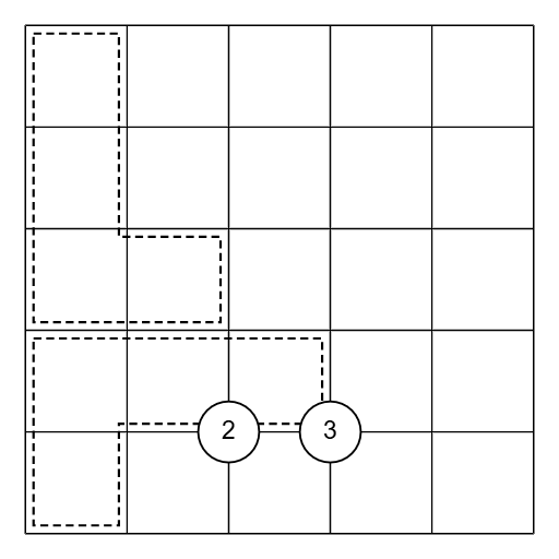 Normal sudoku rules do not apply. Fill the grid with the digits 1–4. Create five orthogonally connected regions of four cells each, all with different shapes under rotation or reflection (tetrominoes). Every row, column, and region must contain the digits 1–4. A digit may repeat in a row or column only if the copies are orthogonally adjacent, and adjacency wraps around the grid edges (e.g., R1C1 and R1C5 can be neighbors). In any outlined cage, the largest digit shows how many different regions are represented inside it. A digit in a white circle must appear in a surrounding cell.