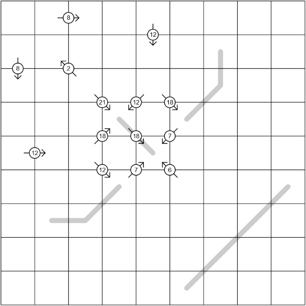 - Der Wert der Zelle, die N Schritte in Richtung eines Pfeils entfernt ist, wird im zugehörigen Kreis angegeben. N ist die Ziffer in der Zelle, von der aus der Pfeil ausgeht (Beispiel: Wenn r5c1 eine 6 wäre, müsste der Wert von r5c7 12 sein).