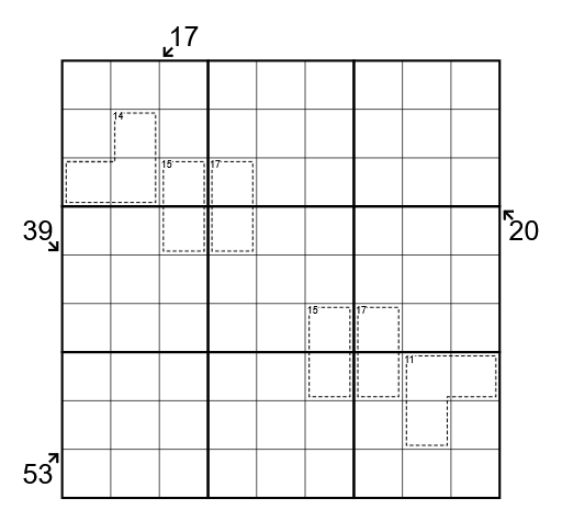 • Little killers: digits along the diagonal arrows sum to the indicated total.