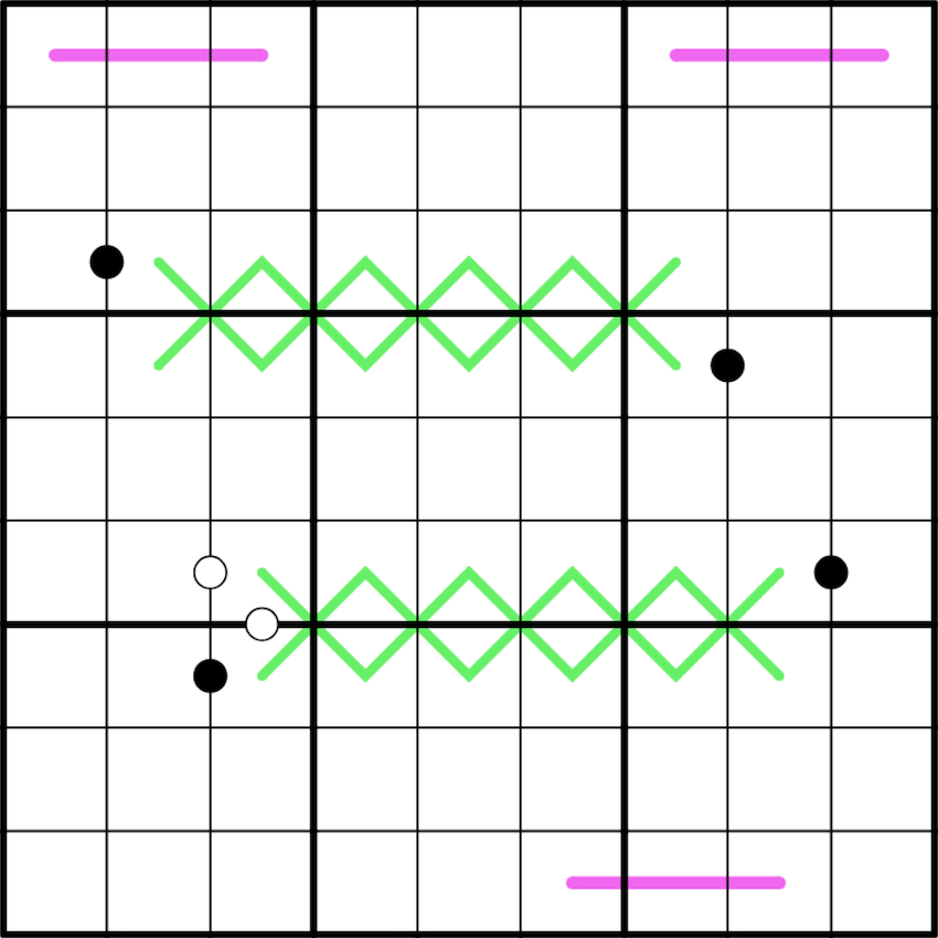Black dots show a ratio of 1:2 between digits and white dots show a difference of one between adjacent digits.