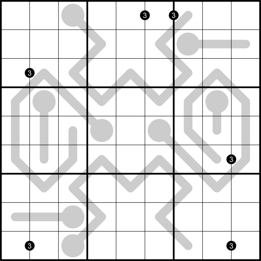- Digits separated by black Kropki dots marked with a three are in a three-to-one ratio.
