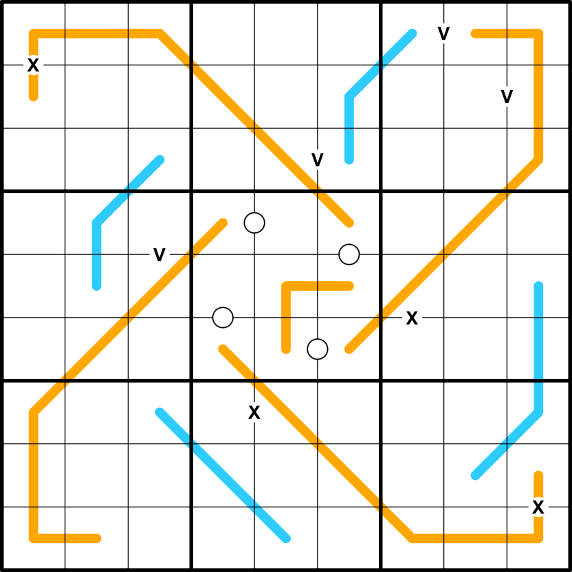 • Adjacent cells on an orange Dutch whisper line must have a difference of at least 4.