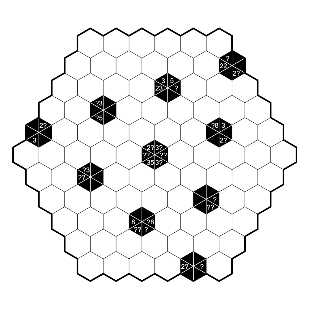 • Hexagonal Kakuro: place a digit from 1 to 9 in every empty cell such that digits do not repeat in an unbroken row of cells with no dark cells separating them. A number in a dark cell gives the sum of the numbers that clue sees in the indicated direction.