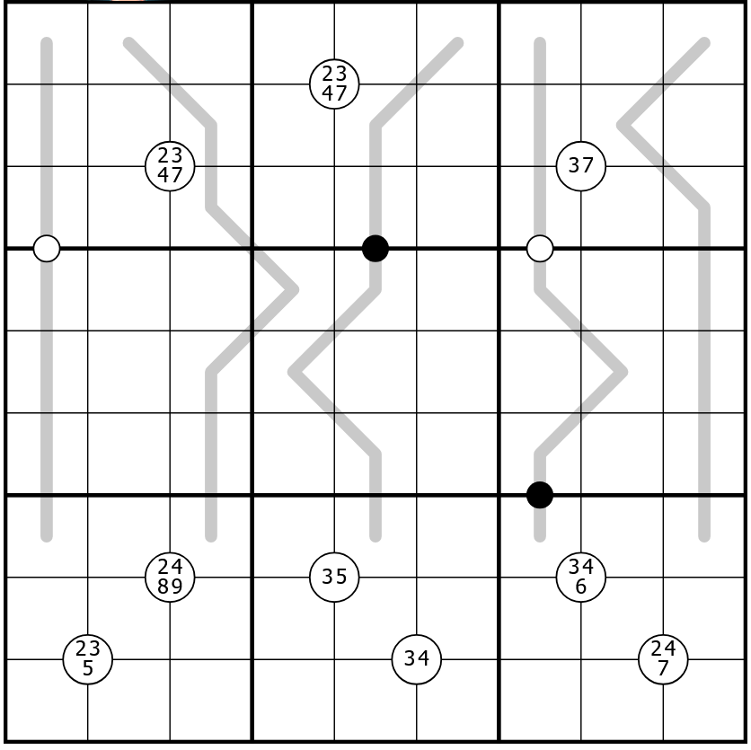 2. KROPKI: Digits separated by a white kropki dot are consecutive. Digits separated by a black kropki dot are in a 1:2 ratio (one digit is double the other).