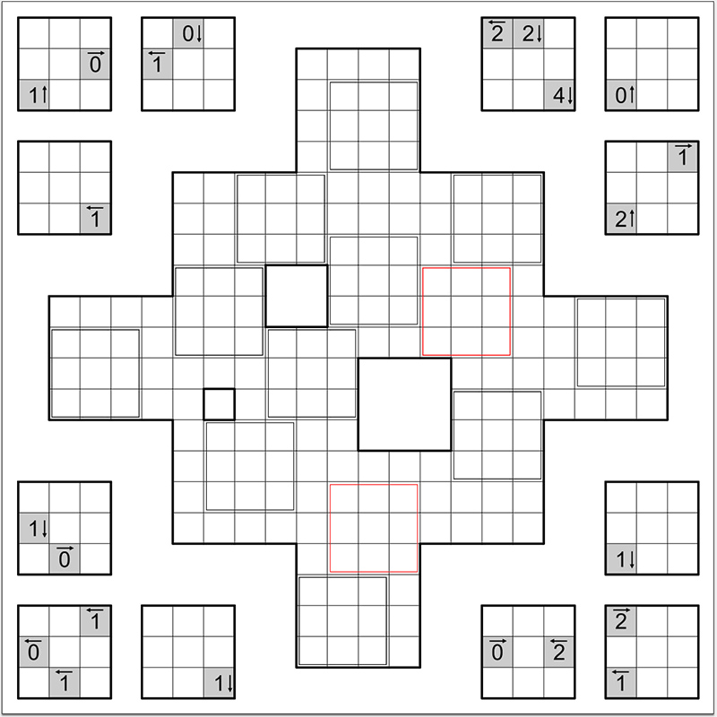 Clones: The two red colored 3x3 slots are exact clones for numerical clues and lines. This means that cells in their same relative positions must have the same numerical clues and the same loop segments.