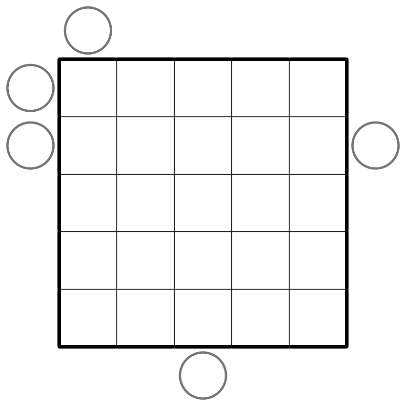 Circles outside the grid must be filled with (1 or 2 digit) numbers that act simultaneously as "Full Rank" clues and "Up To N-Sums" clues. If two ranks are tied, the "Up To N-Sums" clue may match any of those ranks.
