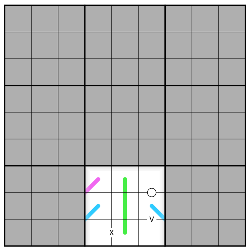 • Digits along a blue line create a sumline where the sum of digits on a line within a particular 3x3 box must be the same for all the boxes the line passes through.