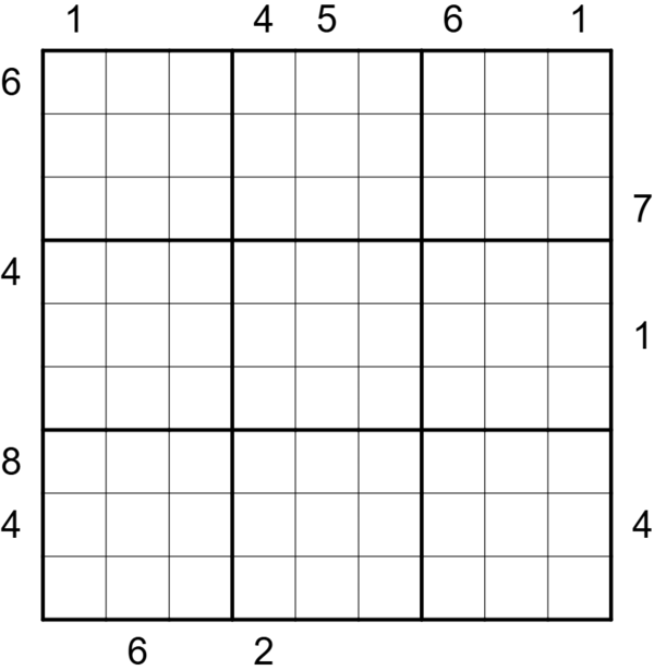 • First Hidden Skyscraper: digits in the grid represent skyscrapers of that height, with taller skyscrapers obscuring smaller ones. A clue outside the grid shows the first digit that cannot be seen from the clue's direction.