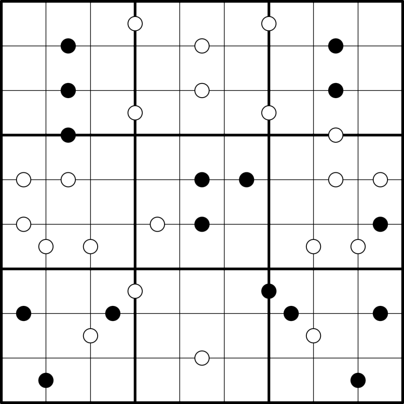 Kropki: digits separated by a white dot are consecutive; digits separated by a black dot are in an 1:2 ratio (i.e. one digit is double the other).