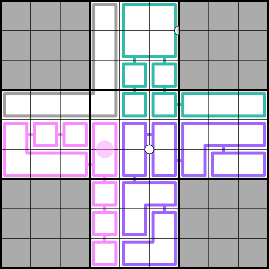 2) Modular: every run of three boxes on a teal line must have one value from each; 0 mod(3), 1 mod(3), and 2 mod(3).
