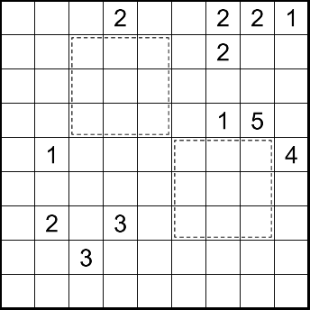 Fillomino: Divide the Fillomino area into orthogonally connected regions such that no two Fillomino regions of the same size share an edge, and enter a number into each cell equal to the size of its region.
