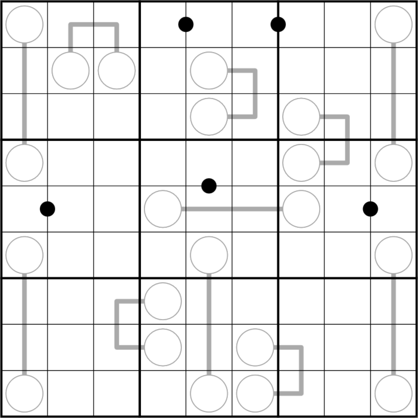 I think Snug Between Lines have a lot of depth and my continued exploration of their implications has resulted in a third Snug Between Line puzzle! Unlike the previous two puzzles, there are no Snug Between Lines sharing a circle, so this time around you will have to find a different way to break into the puzzle :)