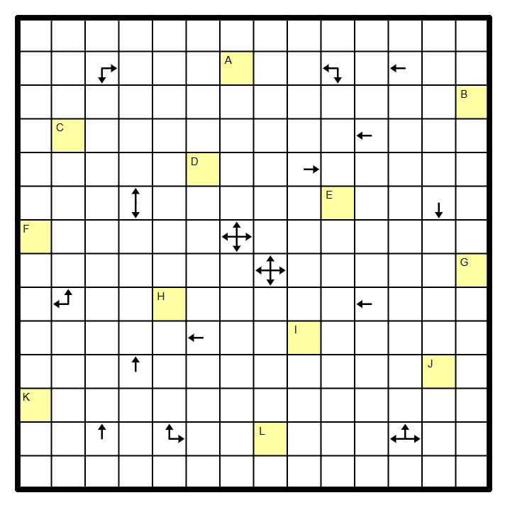 Im Diagramm sind einige der 12 Pentominos zu platzieren, so daß diese einander nicht berühren, nicht einmal diagonal. Pentominos dürfen nicht auf Feldern mit Pfeilen platziert werden.