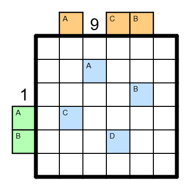 Stehen vor einer Zeile oder Spalte Hinweiszahlen, so geben diese die Summe der Zahlen zwischen den beiden Schwarzfeldern in dieser Zeile bzw. Spalte an.