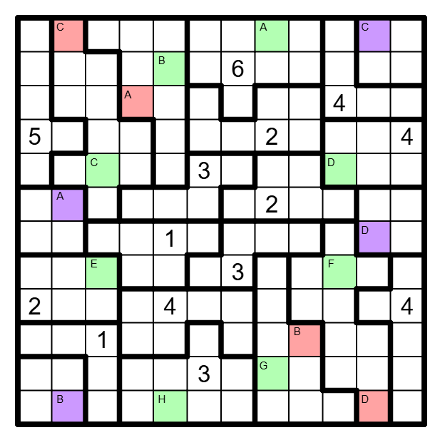 Im Diagramm sind einige Felder zu schwärzen, so daß alle Schwarzfelder orthogonal zusammenhängen und es in keiner Zeile oder Spalte eine Folge von mehr als drei geschwärzten oder ungeschwärzten Feldern gibt. Eine Zahl in einem Gebiet gibt an, wie viele Felder in diesem Gebiet geschwärzt sind.
