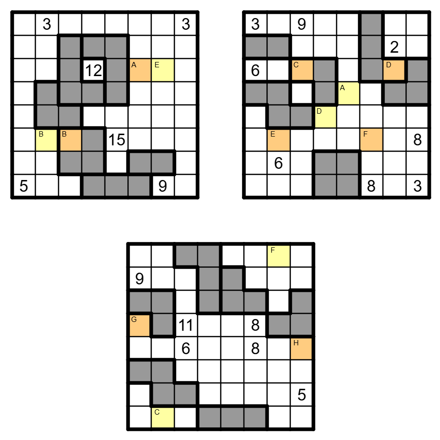 Die grau gefärbten Gebiete sind Klon-Gebiete. Identische Gebiete müssen in entsprechenden Feldern den gleichen Inhalt haben, es müssen also entweder beide Felder leer sein oder beide eine Kerze gleicher Höhe enthalten.