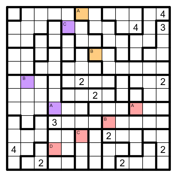 Felder mit gleichen Zahlen die in verschiedenen Gebieten liegen, dürfen einander nicht orthogonal berühren.