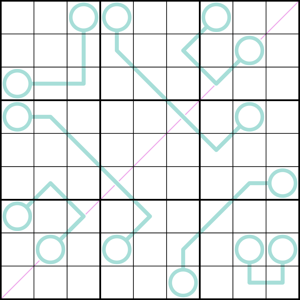 Digits cannot repeat along the pink positive diagonal.