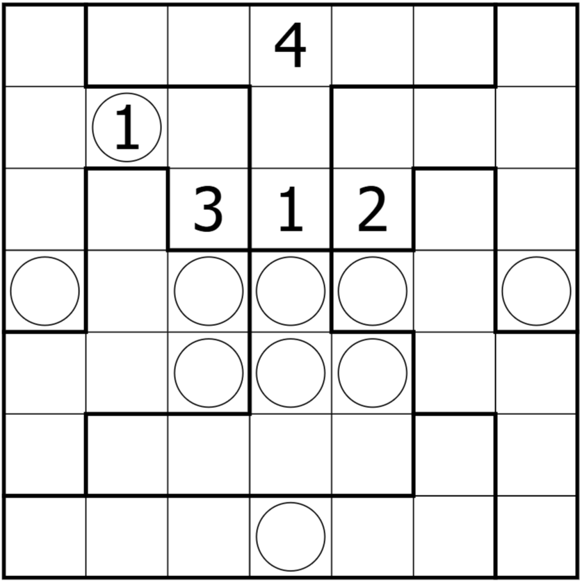 - Chaos Destruction: All given regions must be "destroyed" by making sure they do not contain all the digits 1-7. The grid also consists of seven hidden, orthogonally connected regions that each do contain all the digits 1-7. Digits in circles represent how many of its orthogonally and diagonally adjacent cells, including itself, belong to both the given and hidden regions where the circle resides (i.e., where they overlap).