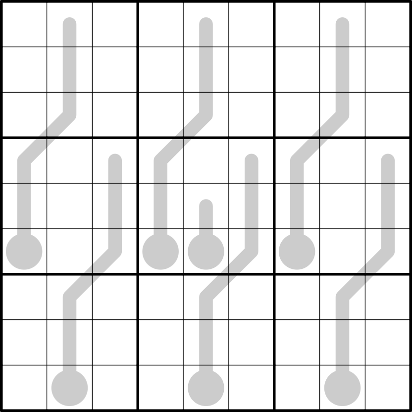 Rules: Sudoku: Fill all rows, columns and marked 3x3 regions with the digits 1-9 without any repeats. Thermometers: Digits along a grey thermometer strictly increase from the bulb-end. Cells separated by a king's move in chess cannot contain the same digit.