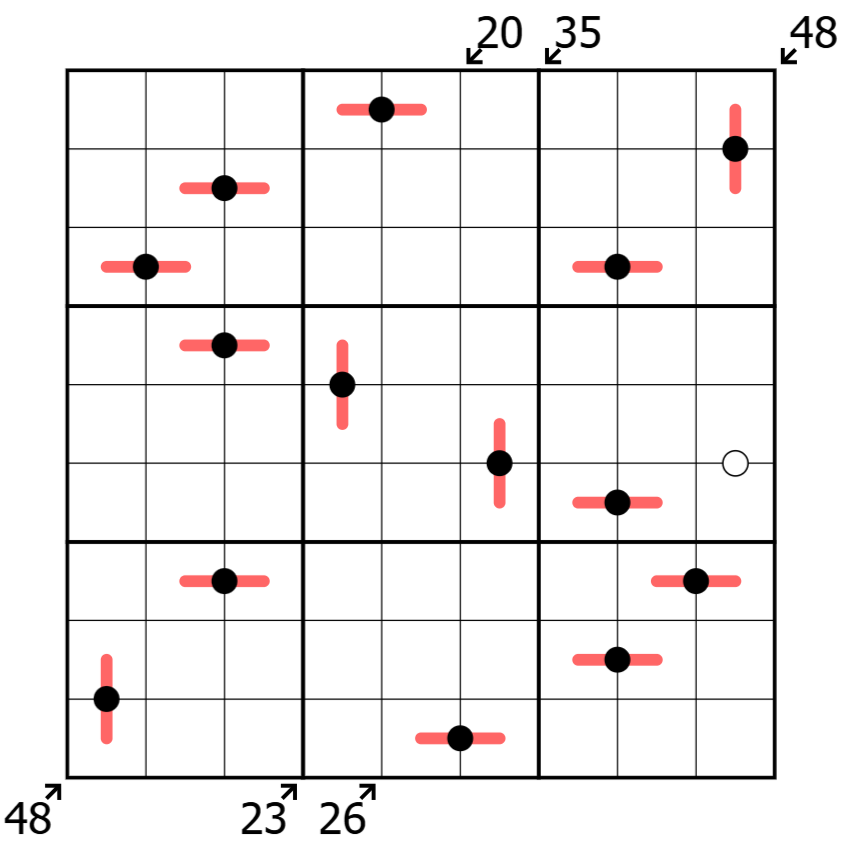 - Kropki: Zahlen, zwischen denen ein schwarzer Punkt liegt, sind im Verhältnis 2:1. Zahlen, zwischen denen ein weisser Punkt liegt, sind aufeinanderfolgend. Nicht alle möglichen Punkte sind gegeben.