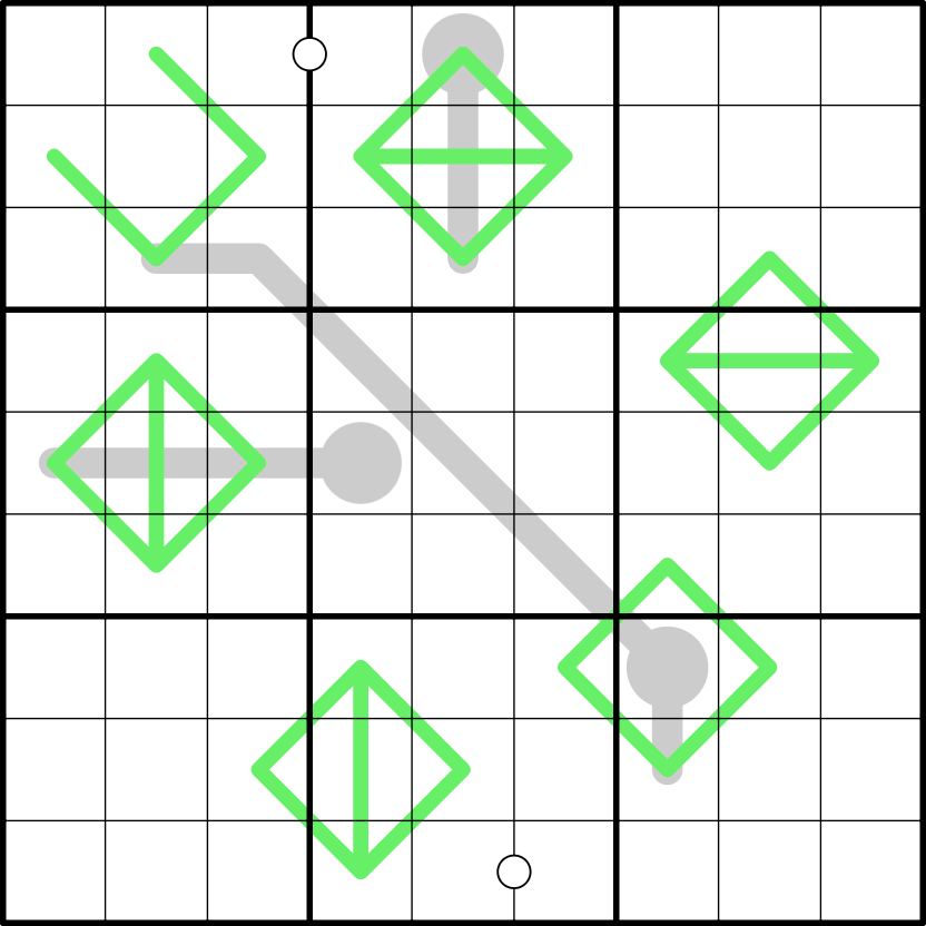 Kropki dots: Digits in cells joined by a white dot are consecutive.
