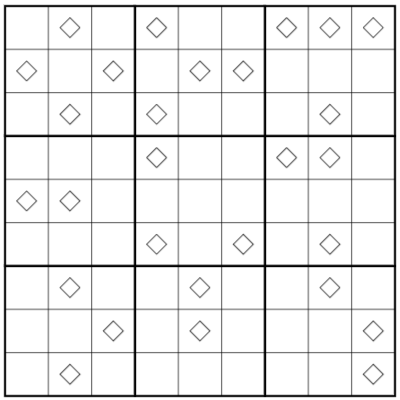Draw a loop (using orthogonal line segments through the centers of cells) such that it visits every cell marked with a diamond. The loop may cross itself, but can only change direction (turn through 90 degrees) at a diamond. Thus, all "corners" of the loop are on diamonds. However, not all diamonds mark loop corners -- "non-corner" diamonds lay on a line segment _between_ two corners.