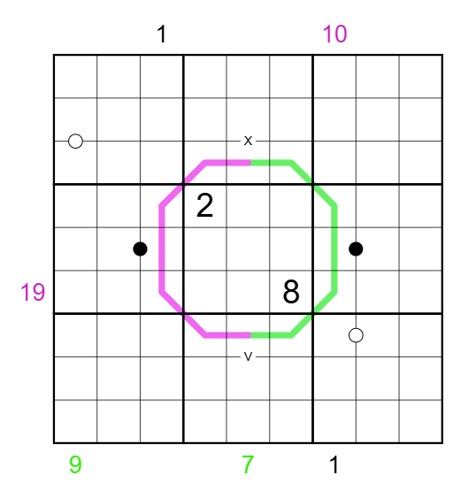• Sandwich Sums (purple): Digits between 1 and 9 in the indicated row or column must sum to the indicated purple value.