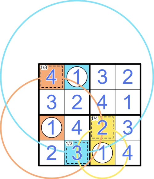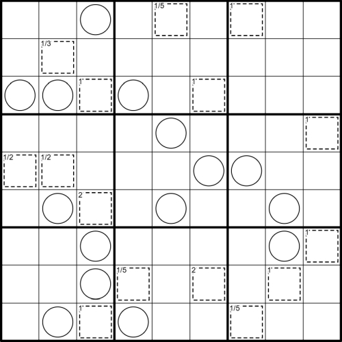 Regeln: Es gelten die normalen Sudoku-Regeln. Ein Käfig steht für ein Objekt, dessen Masse m durch den Hinweis in der oberen linken Ecke angegeben ist. Wenn der Hinweis einen Schrägstrich enthält, wird die Masse in Bruchschreibweise angegeben (z.B. bedeutet m = 1/3 eine Masse von einem Drittel). Jedes Objekt bewegt sich mit einer Geschwindigkeit v, die durch die Ziffer im Käfig angegeben ist, auf einer kreisförmigen Bahn um genau eine eingekreiste Zelle, die um r Zellen entweder horizontal oder vertikal vom Käfig versetzt ist. Die eingekreiste Zelle enthält als Zahl die Zentripetalkraft F = m v2 / r, die erforderlich ist, um die Kreisbewegung des zugehörigen Objekts aufrechtzuerhalten. Die Kreisbahn muss nicht vollständig innerhalb des Sudoku-Gitters liegen.