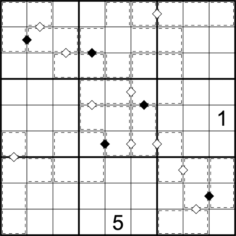 Weisse Rauten (zwischen zwei Käfigen) bedeuten, daß die zwei benachbarten Käfigsummen eine Differenz von X haben, wobei X jener Ziffer entspricht, die am linken Ende der Reihe, bzw oberen Ende der Spalte steht, in der sich die Raute befindet.