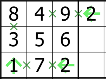Überall wo zwei horizontal oder vertikal benachbarte Ziffern eine Differenz von fünf oder mehr haben, muss ein grüner Punkt zwischen diesen Ziffern platziert werden. Ziffern, die auf einem grünen Pfeil stehen, geben die genaue Anzahl grüner Punkte an, die in Richtung des Pfeils platziert werden müssen. Es sind nicht unbedingt alle möglichen grünen Pfeile gegeben.