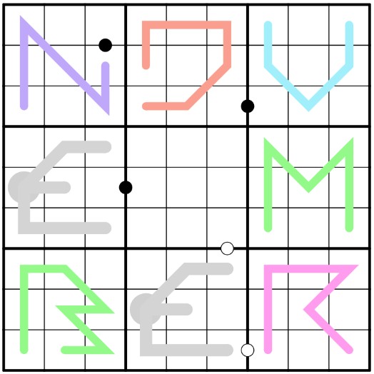 Kropki: Die Zahlen in den Feldern, die mit einem weißen Punkt verbunden sind, haben eine Differenz von 1. Die Zahlen in den Feldern, die mit einem schwarzen Punkt verbunden sind, haben ein Verhältnis von 1:2. Nicht alle möglichen Punkte sind gegeben.