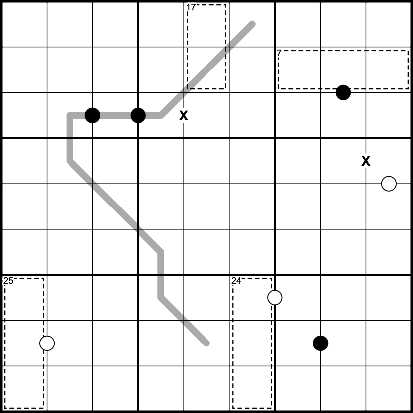• Black Kropki Dots: Cell values separated by black dot are in a 1/2 ratio.