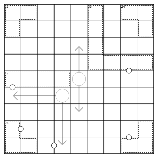 Normal Sudoku rules apply. Digits on an arrow sum to the digit in the circle from which the arrow originates. Digits in a cage do not repeat and sum to the number in its corner. Digits separated by an white dot are consecutive.