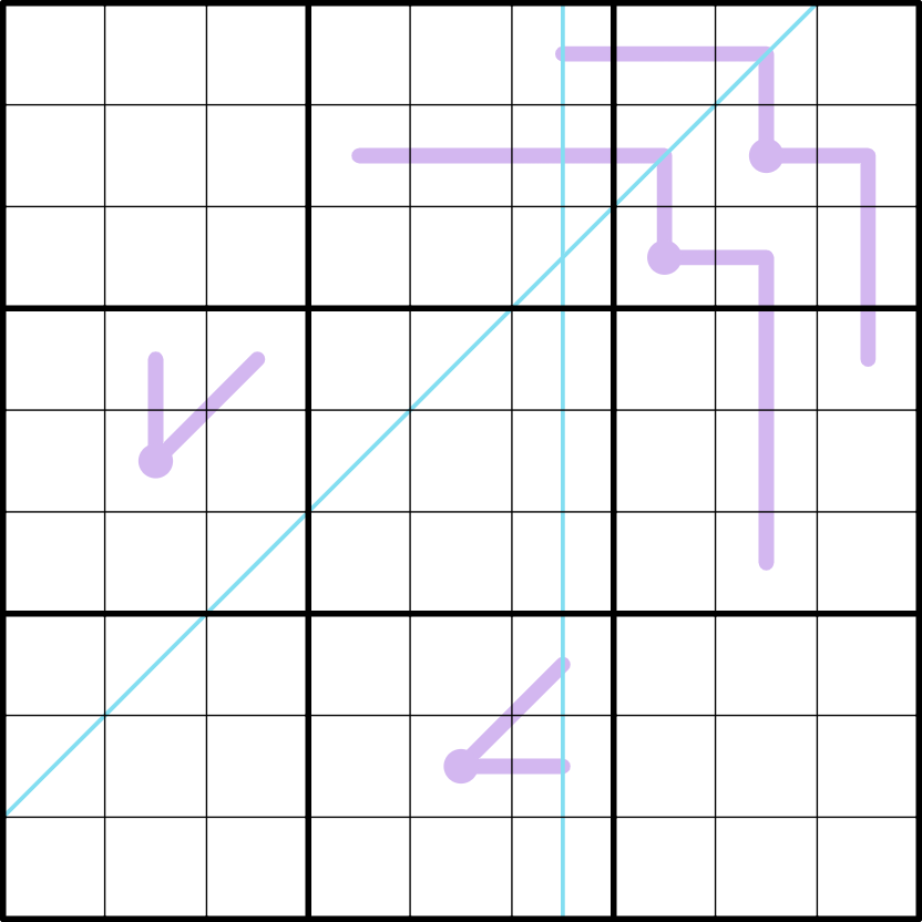 Zippers: Along a purple line, any two cells an equal distance along the line from the center cell will add to the digit in the center cell.