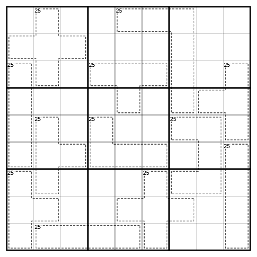 - Killer cages: Digits in a cage do not repeat and must sum to 25.