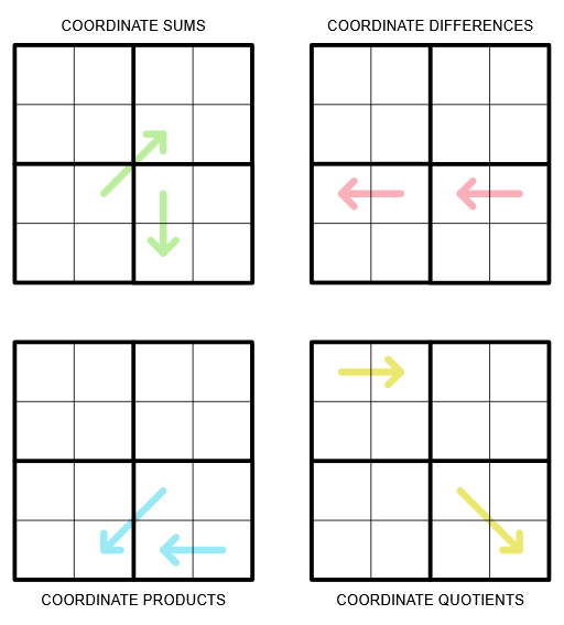 Lösungscode: Row 4 from each grid in order (Coordinate Sums, Coordinate Differences, Coordinate Products, Coordinate Quotients)