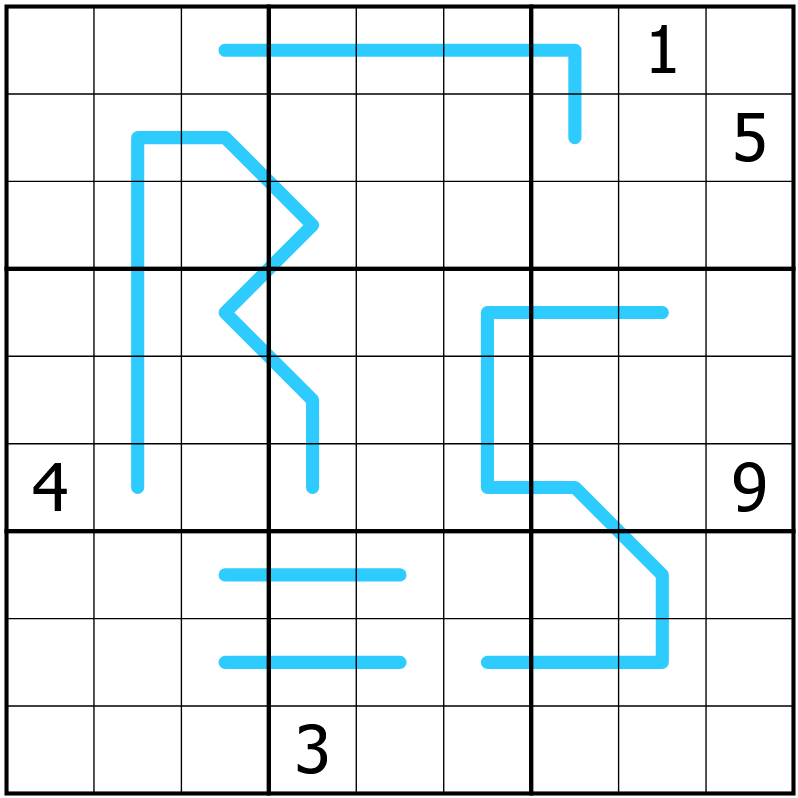 • Region sum lines: Die Grenzen der 9 Boxen teilen eine Linie in Segmente, die je Linie die gleiche Summe haben müssen.