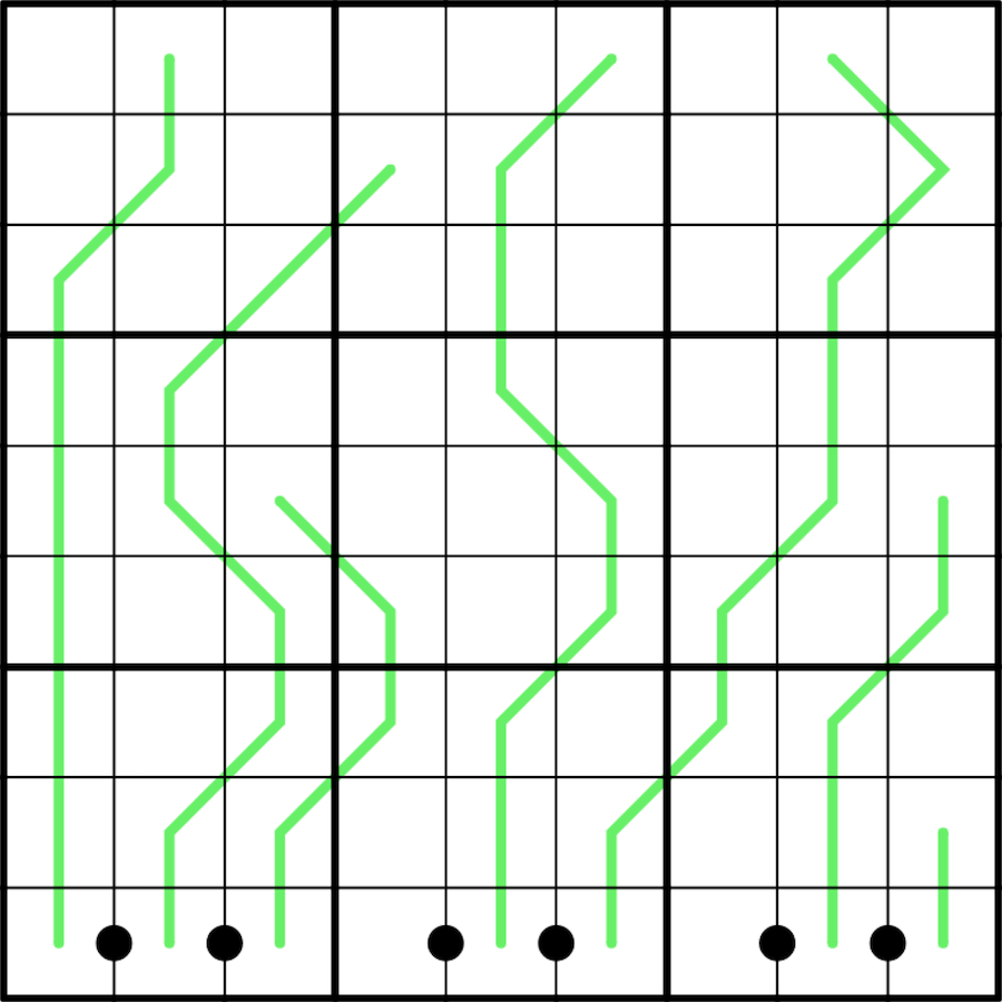 Black dots connect digits that are in the ratio (integers from 2 to 9 inclusive) shown in the centre of the dot - if no ratio shown solver must deduce this. All dots in row nine are given.